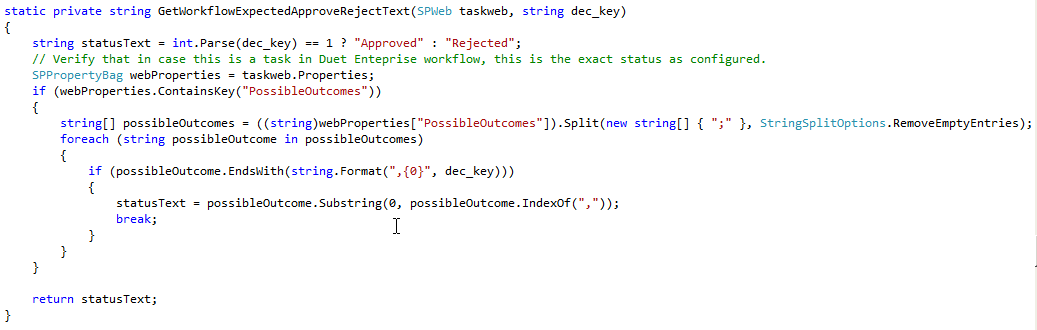 - Specific for Duet Enterprise tasks: In ItemUpdating eventreceiver, multiple checks are done to verify that it is indeed the intention to propagate to SAP. One of these checks is that a string-compare is done on both the set status text as status code. If this string-concattenation is not present in the Duet Enterprise task PossibleOutcomes (you specify this when you in SharePoint ‘Configure a new SAP workflow task type’), then the SharePoint task update succeeds, but the update is silently not propagated onto the connected SAP side. To make sure the programatically set status text is in sync with the configured PossibleOutcomes, I derive the status text based on that same configured PossibleOutcomes: