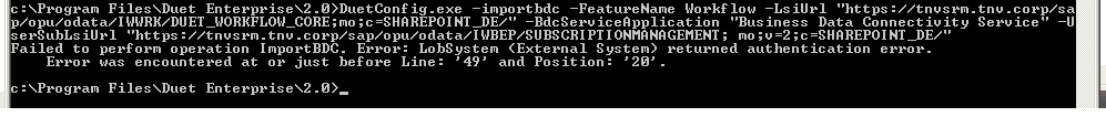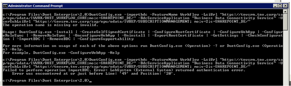 For instance occurs with the DuetConfig command to configure workflow, command with multiple operation parameters: DuetConfig.exe -importbdc -FeatureName Workflow -LsiUrl "https://tnvsrm.tnv.corp/sap/opu/odata/IWWRK/DUET_WORKFLOW_CORE;mo;c=SHAREPOINT_DE/" -BdcServiceApplication "Business Data Connectivity Service" -UserSubLsiUrl "https://tnvsrm.tnv.corp/sap/opu/odata/IWBEP/SUBSCRIPTIONMANAGEMENT; mo;v=2;c=SHAREPOINT_DE/"